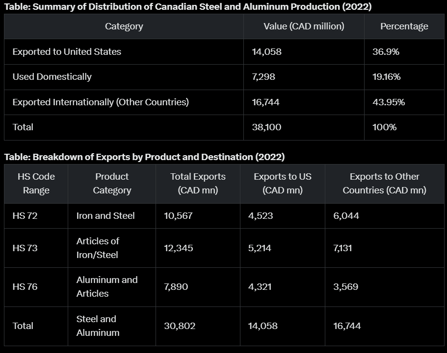 According to Statistics Canada, in 2022, approximately 37% of Canadian-produced steel and aluminum was exported to the United States, 19% was used domestically, and the remaining 44% was exported internationally to non-American countries.